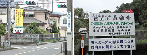 秋川街道の西田橋信号にある看板を目印に曲がり、少し細くなった道を進むとその先、入口に付近に「公園墓地八王子メモリアルパーク」の大きな看板が見えてきます。