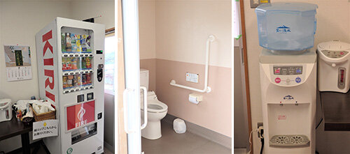 休憩所中には無料で使えるウォーターサーバと自販機が置いてあり、どなたでも利用できます。トイレは管理事務所の横にありますが、車いすでも入れるバリアフリーのトイレも用意されています。