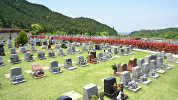 たじまやクリーニング店より水路に沿って約200m歩き、突き当たりの角を右折すると左手に墓地があります。
