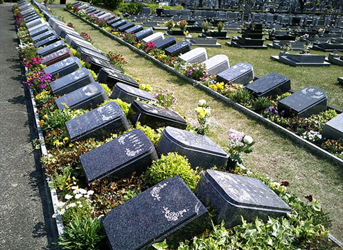 一般的なお墓と比べ、色とりどりの明るい墓石と緑いっぱいの花々でおまいりが楽しくなる造りを目指しました。